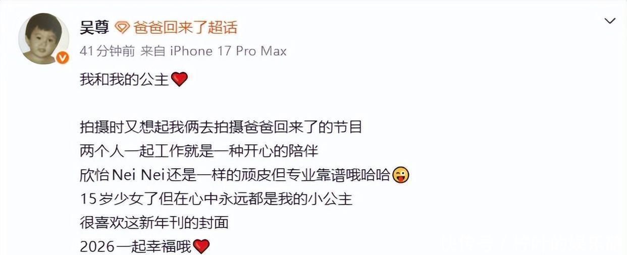 对于NeiNei被传早恋这事儿,吴尊表现得特别豁达。2025年10月期间,有网民留意到NeiNei在社交媒体上直接点名了一个叫“Chris”的男生,还有人在该男生主页下评论说“要好好对待NeiNei,祝你们长长久久幸福下去”。